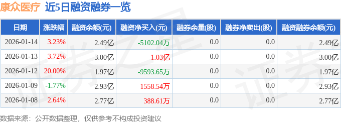 康众医疗融资融券信息显示,融资方面,当日融资买入1.33亿元,融资偿还1.84亿元,融资净偿还5102.04万元。融券方面,融券卖出0.0股,融券偿还0.0股,融券余量0.0股,融券余额0.0万元。融资融券余额2.49亿元。