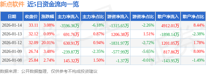 证券之星消息,截至2026年1月14日收盘,新点软件(688232)报收于33.11元,上涨3.08%,换手率5.34%,成交量17.2万手,成交额5.82亿元。