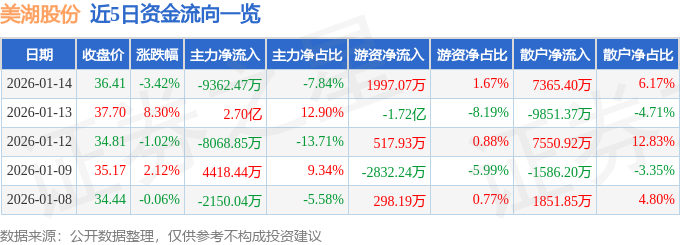 证券之星消息,截至2026年1月14日收盘,美湖股份(603319)报收于36.41元,下跌3.42%,换手率9.58%,成交量32.49万手,成交额11.95亿元。