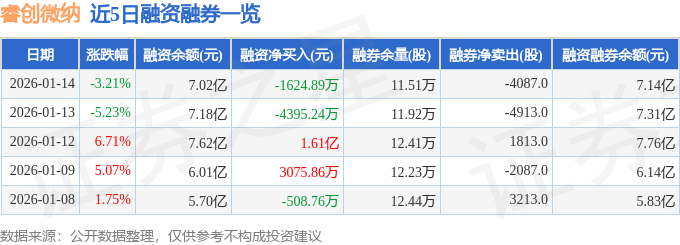 证券之星消息,截至2026年1月14日收盘,睿创微纳(688002)报收于104.8元,下跌3.2%,换手率3.22%,成交量14.8万手,成交额15.74亿元。