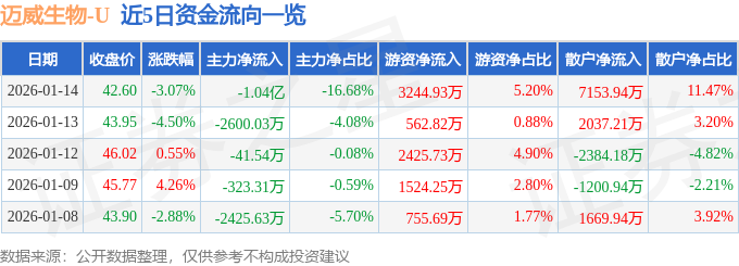 证券之星消息,截至2026年1月14日收盘,迈威生物(688062)报收于42.6元,下跌3.07%,换手率7.03%,成交量14.36万手,成交额6.24亿元。
