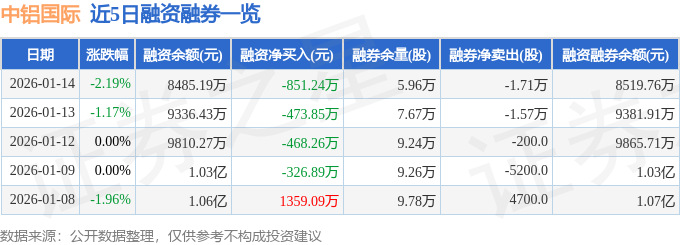 证券之星消息,截至2026年1月14日收盘,中铝国际(601068)报收于5.8元,下跌2.19%,换手率1.32%,成交量33.78万手,成交额1.98亿元。