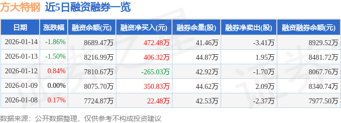 证券之星消息,截至2026年1月14日收盘,方大特钢(600507)报收于5.79元,下跌1.86%,换手率1.46%,成交量33.83万手,成交额1.98亿元。