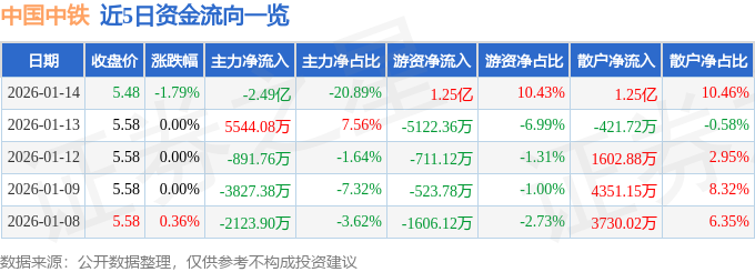 证券之星消息,截至2026年1月14日收盘,中国中铁(601390)报收于5.48元,下跌1.79%,换手率1.05%,成交量215.34万手,成交额11.94亿元。