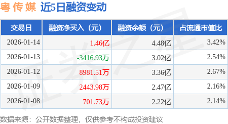 证券之星消息,1月14日,粤 传 媒(002181)融资买入3.11亿元,融资偿还1.65亿元,融资净买入1.46亿元,融资余额4.48亿元,当日融资净买入排名第50,近20个交易日中有11个交易日出现融资净买入。