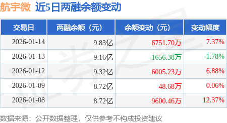 证券之星消息,1月14日,航宇微(300053)融资买入3.64亿元,融资偿还2.96亿元,融资净买入6750.02万元,融资余额9.83亿元,近20个交易日中有11个交易日出现融资净买入。