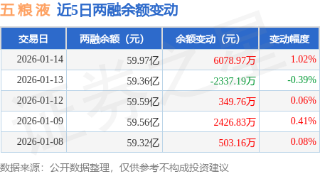 证券之星消息,1月14日,五 粮 液(000858)融资买入2.28亿元,融资偿还1.7亿元,融资净买入5875.74万元,融资余额59.13亿元。