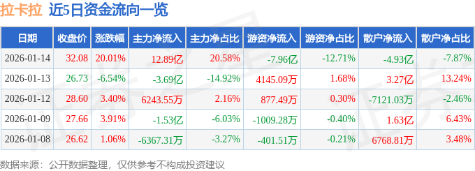 证券之星消息,截至2026年1月14日收盘,拉卡拉(300773)报收于32.08元,上涨20.01%,涨停,换手率27.64%,成交量203.01万手,成交额62.65亿元。