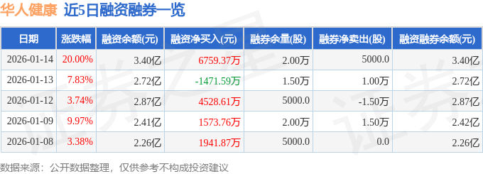 证券之星消息,截至2026年1月14日收盘,华人健康(301408)报收于29.76元,上涨20.0%,涨停,换手率54.39%,成交量81.14万手,成交额22.07亿元。