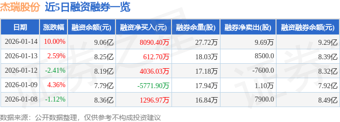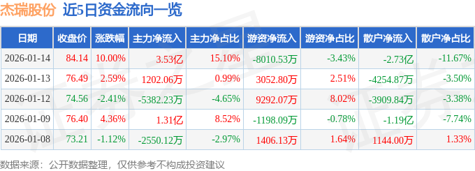 证券之星消息,截至2026年1月14日收盘,杰瑞股份(002353)报收于84.14元,上涨10.0%,涨停,换手率4.16%,成交量28.81万手,成交额23.38亿元。