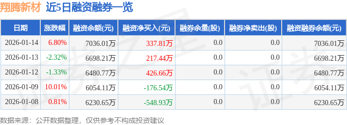 证券之星消息,截至2026年1月14日收盘,翔腾新材(001373)报收于39.59元,上涨6.8%,换手率13.69%,成交量4.54万手,成交额1.75亿元。