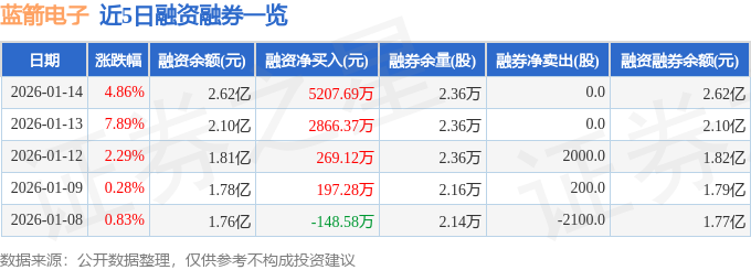 证券之星消息,截至2026年1月14日收盘,蓝箭电子(301348)报收于25.23元,上涨4.86%,换手率29.51%,成交量45.78万手,成交额11.6亿元。