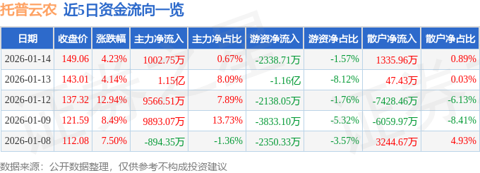 证券之星消息,截至2026年1月14日收盘,托普云农(301556)报收于149.06元,上涨4.23%,换手率33.76%,成交量9.95万手,成交额14.94亿元。