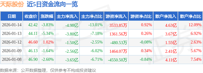 证券之星消息,截至2026年1月14日收盘,天际股份(002759)报收于42.42元,下跌3.83%,换手率17.88%,成交量89.56万手,成交额38.27亿元。