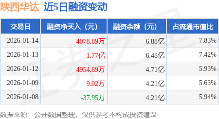 证券之星消息,1月14日,陕西华达(301517)融资买入4.09亿元,融资偿还3.68亿元,融资净买入4078.89万元,融资余额6.88亿元,近3个交易日已连续净买入累计2.67亿元,近20个交易日中有13个交易日出现融资净买入。