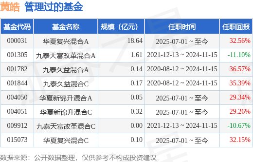 黄皓先生:西南财经大学金融学硕士,中国籍,2008年3月2009年9月,就职于国海证券股份有限公司,任研究所行业研究员;2009年10月至2011年11月,就职于摩根士丹利华鑫基金管理有限公司,任研究发展部研究员、基金投资部基金经理助理;2012年1月至2018年3月,就职于前海人寿保险股份有限公司,任资产管理部投资经理、权益投资室经理助理、资产管理中心权益投资部总经理助理、副总经理、总经理。2018年3月加入九泰基金管理有限公司,任权益投资总监兼中正和权益投资部总经理。曾担任九泰久益灵活配置混合型证券投资基金、九泰天富改革新动力灵活配置混合型证券投资基金基金经理。2024年11月加入华夏基金管理有限公司。2025年7月1日任华夏复兴混合型证券投资基金、华夏新锦升灵活配置混合型证券投资基金基金经理。