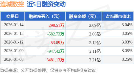 证券之星消息,1月14日,连城数控(920368)融资买入2098.07万元,融资偿还1799.56万元,融资净买入298.51万元,融资余额2.09亿元,近20个交易日中有15个交易日出现融资净买入。