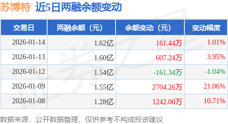 证券之星消息,1月14日,苏博特(603916)融资买入6972.89万元,融资偿还6814.28万元,融资净买入158.61万元,融资余额1.61亿元。