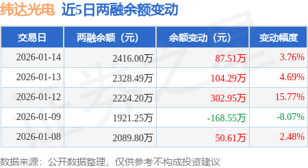 证券之星消息,1月14日,纬达光电(920001)融资买入845.88万元,融资偿还758.38万元,融资净买入87.51万元,融资余额2416.0万元,近3个交易日已连续净买入累计494.74万元。