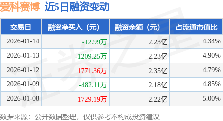 证券之星消息,1月14日,爱科赛博(688719)融资买入8233.14万元,融资偿还8246.13万元,融资净卖出12.99万元,融资余额2.23亿元。