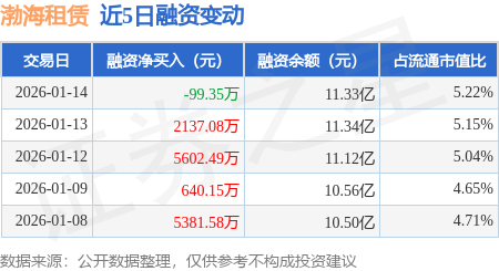 证券之星消息,1月14日,渤海租赁(000415)融资买入5713.94万元,融资偿还5813.29万元,融资净卖出99.35万元,融资余额11.33亿元,近20个交易日中有17个交易日出现融资净买入。