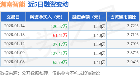 证券之星消息,1月14日,迦南智能(300880)融资买入1540.08万元,融资偿还1660.65万元,融资净卖出120.57万元,融资余额1.38亿元。