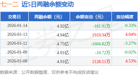 证券之星消息,1月14日,七一二(603712)融资买入1.61亿元,融资偿还1.63亿元,融资净卖出199.7万元,融资余额4.92亿元。