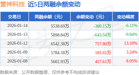 证券之星消息,1月14日,雷神科技(920190)融资买入2573.29万元,融资偿还2933.43万元,融资净卖出360.15万元,融资余额5538.69万元,近20个交易日中有11个交易日出现融资净买入。