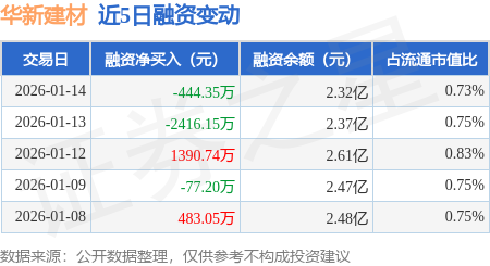 证券之星消息,1月14日,华新建材(600801)融资买入1018.48万元,融资偿还1462.83万元,融资净卖出444.35万元,融资余额2.32亿元。