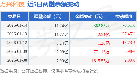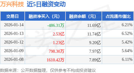 证券之星消息,1月14日,万兴科技(300624)融资买入7.36亿元,融资偿还7.41亿元,融资净卖出486.31万元,融资余额11.69亿元。