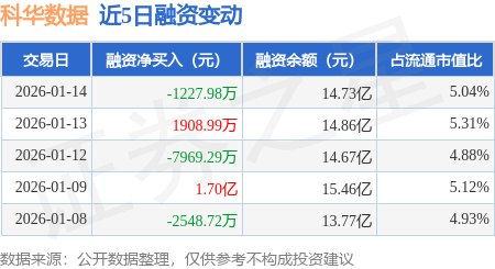 证券之星消息,1月14日,科华数据(002335)融资买入3.99亿元,融资偿还4.11亿元,融资净卖出1227.98万元,融资余额14.73亿元。