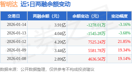 证券之星消息,1月14日,智明达(688636)融资买入1.33亿元,融资偿还1.46亿元,融资净卖出1279.62万元,融资余额3.91亿元。