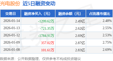 证券之星消息,1月14日,光电股份(600184)融资买入3204.91万元,融资偿还4504.53万元,融资净卖出1299.62万元,融资余额2.49亿元。