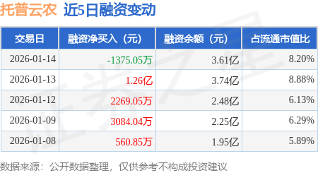 证券之星消息,1月14日,托普云农(301556)融资买入2.24亿元,融资偿还2.38亿元,融资净卖出1375.05万元,融资余额3.61亿元,近20个交易日中有12个交易日出现融资净买入。