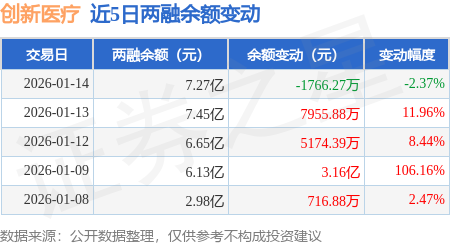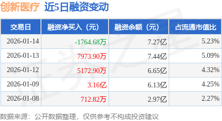 证券之星消息,1月14日,创新医疗(002173)融资买入5.02亿元,融资偿还5.2亿元,融资净卖出1764.68万元,融资余额7.27亿元。