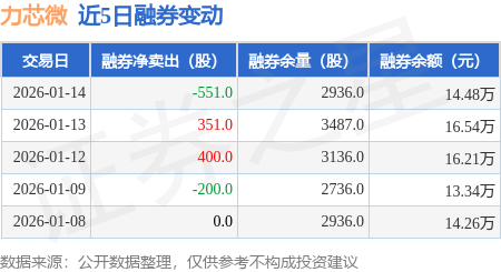 证券之星消息,1月14日,力芯微(688601)融资买入4867.35万元,融资偿还6841.66万元,融资净卖出1974.3万元,融资余额2.84亿元。