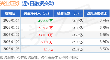 证券之星消息,1月14日,兴业证券(601377)融资买入1.86亿元,融资偿还2.31亿元,融资净卖出4538.86万元,融资余额23.05亿元。
