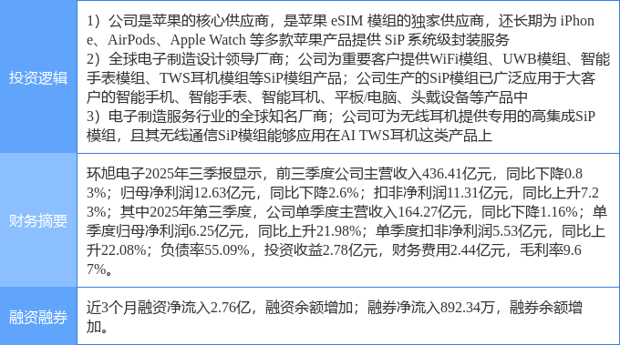 证券之星消息,环旭电子1月15日涨停收盘,收盘价30.57元。该股于14点8分涨停,7次打开涨停,截止收盘封单资金为2000.57万元,占其流通市值0.03%。