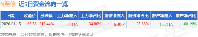 证券之星消息,截至2026年1月15日收盘,N至信(603352)报收于68.58元,上涨213.44%,换手率78.67%,成交量34.95万手,成交额25.27亿元。