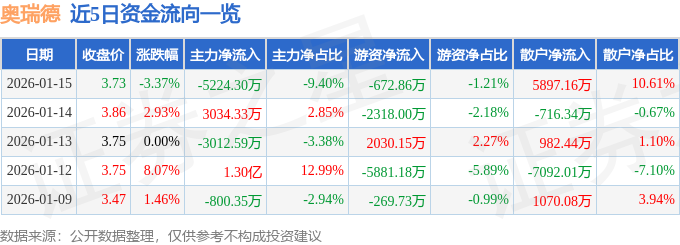 证券之星消息,截至2026年1月15日收盘,奥瑞德(600666)报收于3.73元,下跌3.37%,换手率6.12%,成交量148.03万手,成交额5.56亿元。