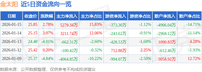 证券之星消息,截至2026年1月15日收盘,金太阳(300606)报收于25.85元,上涨2.78%,换手率11.1%,成交量13.06万手,成交额3.34亿元。