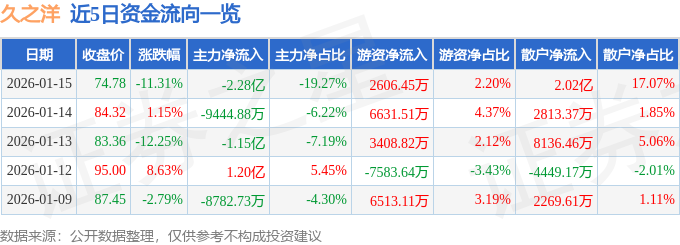 证券之星消息,截至2026年1月15日收盘,久之洋(300516)报收于74.78元,下跌11.31%,换手率8.68%,成交量15.62万手,成交额11.83亿元。