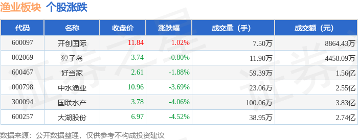 证券之星消息,1月15日渔业板块较上一交易日下跌2.59%,大湖股份领跌。当日上证指数报收于4112.6,下跌0.33%。深证成指报收于14306.73,上涨0.41%。渔业板块个股涨跌见下表: