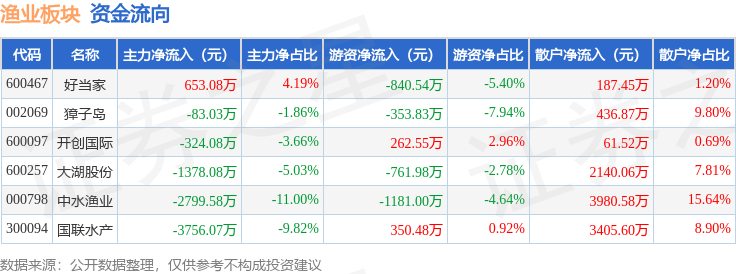 从资金流向上来看,当日渔业板块主力资金净流出7687.76万元,游资资金净流出2524.32万元,散户资金净流入1.02亿元。渔业板块个股资金流向见下表: