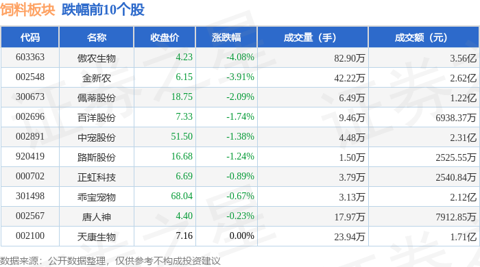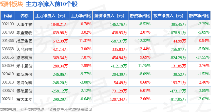 从资金流向上来看,当日饲料板块主力资金净流出1.16亿元,游资资金净流入43.41万元,散户资金净流入1.16亿元。饲料板块个股资金流向见下表: