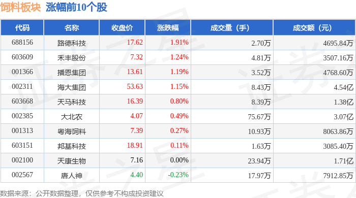 证券之星消息,1月15日饲料板块较上一交易日上涨0.13%,路德科技领涨。当日上证指数报收于4112.6,下跌0.33%。深证成指报收于14306.73,上涨0.41%。饲料板块个股涨跌见下表:
