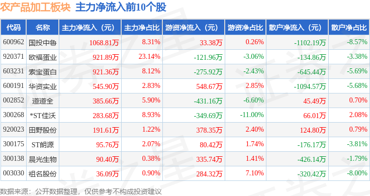 从资金流向上来看,当日农产品加工板块主力资金净流出8002.5万元,游资资金净流入4699.46万元,散户资金净流入3303.04万元。农产品加工板块个股资金流向见下表: