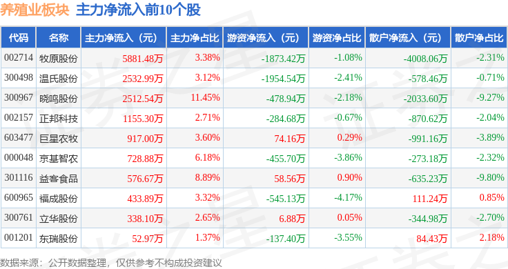 从资金流向上来看,当日养殖业板块主力资金净流出4.55万元,游资资金净流出4309.47万元,散户资金净流入4314.02万元。养殖业板块个股资金流向见下表: