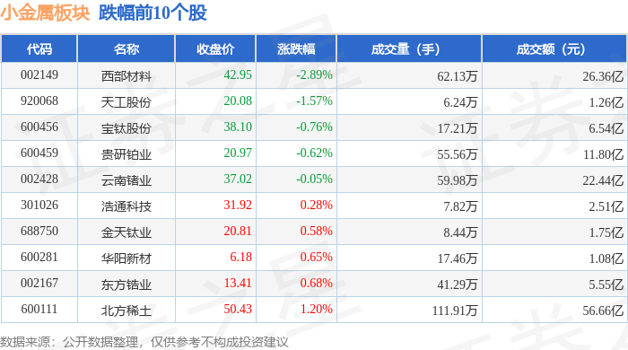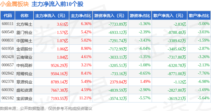 从资金流向上来看,当日小金属板块主力资金净流入11.82亿元,游资资金净流出6.1亿元,散户资金净流出5.71亿元。小金属板块个股资金流向见下表: