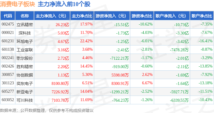 从资金流向上来看,当日消费电子板块主力资金净流入21.48亿元,游资资金净流出12.97亿元,散户资金净流出8.51亿元。消费电子板块个股资金流向见下表: